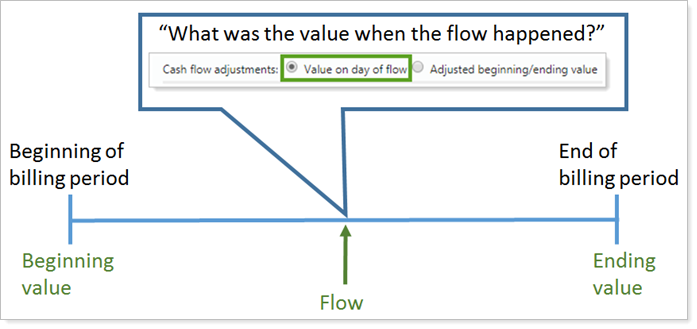 Previously, for billing definitions that bill by category, you could only approximate the account value using the Adjusted beginning/ending value option. With this enhancement, you can adjust cash flow using the Value on day of flow option.