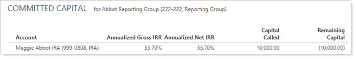 Annualization allows you to compare returns for different date periods greater than a year by converting the returns for each disparate period to a yearly rate. With this release, you can harness the power of annualization to compare internal rate of return (IRR) on the Committed Capital report. For example, you might evaluate annualized IRR for accounts that have held the same committed capital for a variety of different time periods.