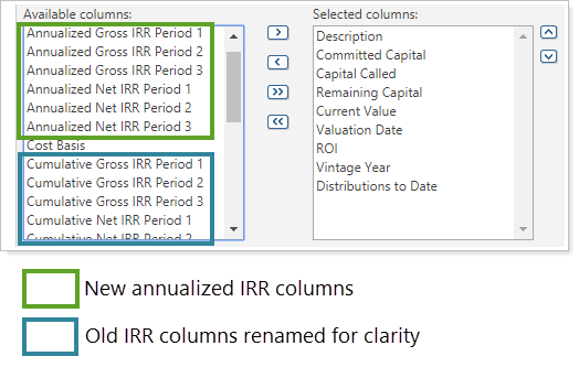 To prevent confusion, the original columns called Net IRR and Gross IRR were renamed to Cumulative Net IRR and Cumulative Gross IRR. This name change will only apply to existing reports with those columns added where the name was not customized. It will not affect any IRR columns you changed to have a custom formatted name.