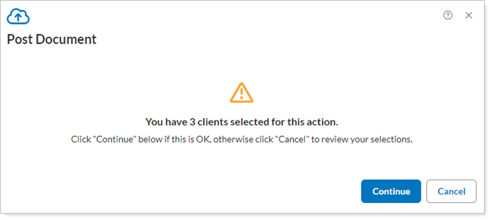 Multiple clients Selected alert. On the Clients page, if you have multiple clients selected when you start to post a file, you'll receive an alert warning you that multiple clients are selected. This helps prevent inadvertently posting to more clients than you intend.
