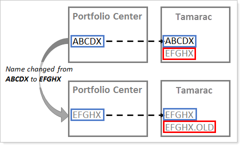 For example, security ABCDX exists in Portfolio Center and is synced with Tamarac. Additionally, Tamarac Reporting has a security called EFGHX that does not exist in Portfolio Center. If the symbol for security ABCDX is changed to EFGHX, on the next sync, the corresponding Tamarac symbol will be updated, creating a duplicate listing for EFGHX. To resolve this, .OLD is appended to the existing Tamarac security, which now is called EFGHX.OLD.