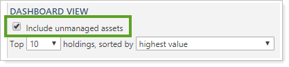 The Include unmanaged assets option on the Holdings report dashboard now allows you to control when you see unmanaged assets.