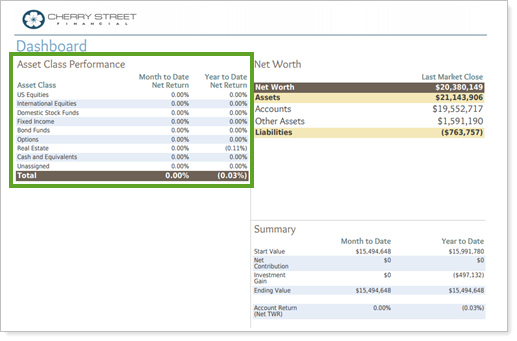 You can now report on category-level returns for account performance on the PDF dashboard You might choose to use this if you want to provide a simple table that lists performance by account or if you want to summarize security category performance with one line for each category.