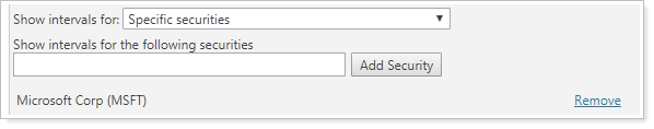 To view interval performance for select securities, on the Interval Performance report choose Specific securities from the Show intervals for list. You can then add the desired securities.