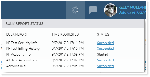 As the report is running, the widget indicates the ongoing work by circling. When the bulk report finishes, you can download it directly from the widget by clicking the Succeeded link.
