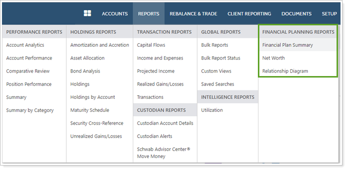 To make it easier to find reports, we've reorganized some of the items under the Reports menu. Now you'll find the Net Worth report, Relationship Diagram, and Financial Plan Summary report in the new Financial Planning Reports section.
