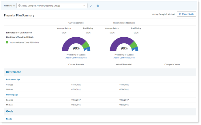 Tamarac now offers direct access to a dynamic version of MoneyGuide's Financial Plan Summary report to you and, optionally, to your clients to support you as client conversations shift to financial planning and goals. With this dynamic report, you can access a client's financial plan details to facilitate more holistic discussions. If desired, you can share the report with clients through the client portal to show how your firm helps them achieve their financial goals.