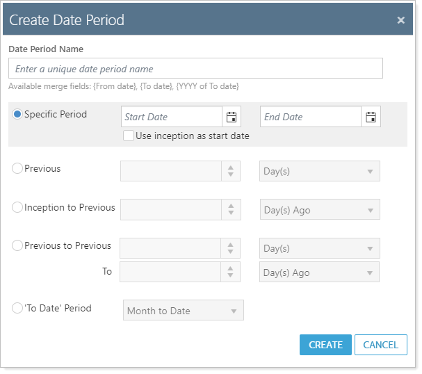 | {From date} | A date in MM/DD/YYYY format | Shows the calculated or explicitly stated beginning date for this date period. If the beginning of the date period is inception, this merge field will show Inception. |