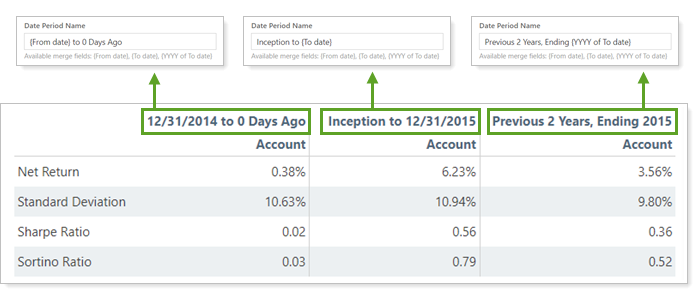 When used in reports, these merge fields add a customizable date period name that automatically updates dates using the merge fields entered. These merge fields work throughout Tamarac.