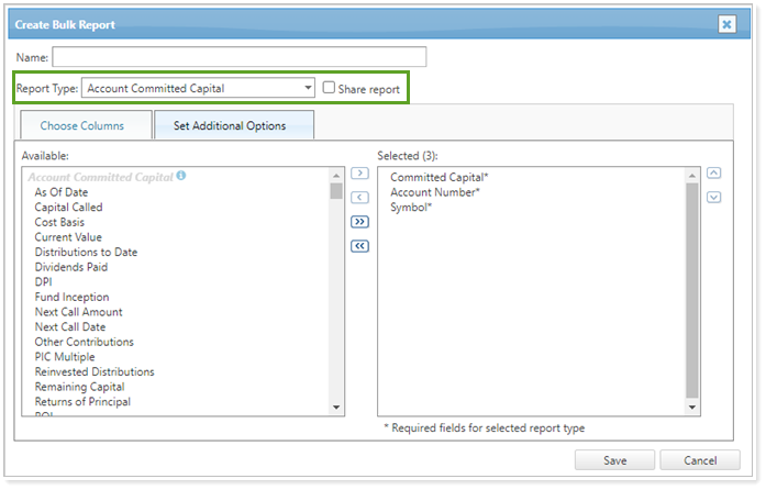 You can see these changes when creating or updating the Account Committed Capital bulk report. There will now be additional columns in the Available list.