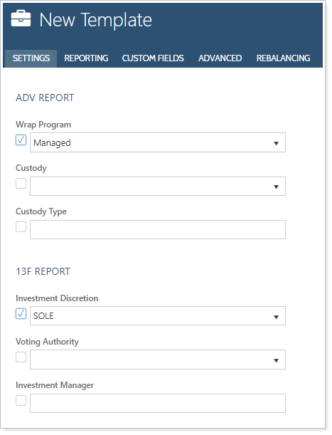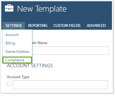 To set up these compliance reporting settings, create a new or edit an existing account template and select Compliance under Settings.