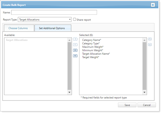 You can run this report from the bulk report page or from the target allocation page. To run the report from the target allocation page, you must have created a target allocation bulk report type.