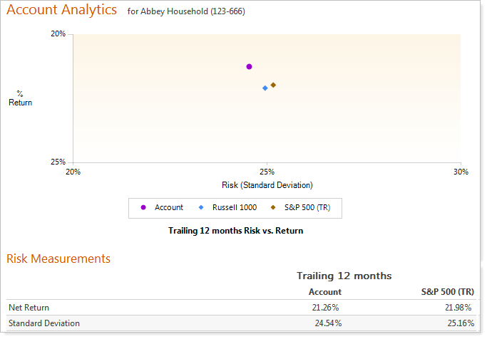 With the Account Analytics report you can chart risk-adjusted comparisons to benchmarks and indexes for your client portfolios. You can customize reports with relative statistics and portfolio metrics to better manage risk-adjusted returns. Report options include standard deviation, Sharpe ratio, alpha and beta, upside/downside capture, information ratio, and more.