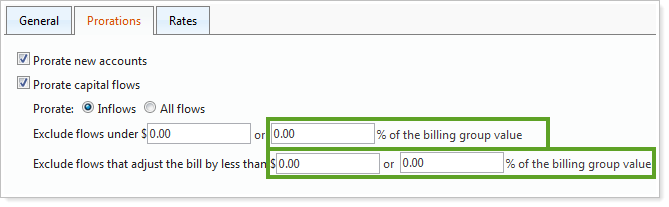 Instead of prorating capital flows by a dollar amount, some clients wanted to prorate capital flows that are more than a particular percentage of the billing group value. We've listened to your requests and have added this functionality to the Advisor View billing module.