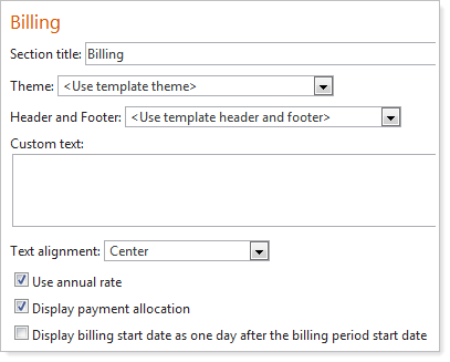 To hide the payment allocation on your billing statements, in the Billing section of your PDF template, clear the Display payment allocation check box.