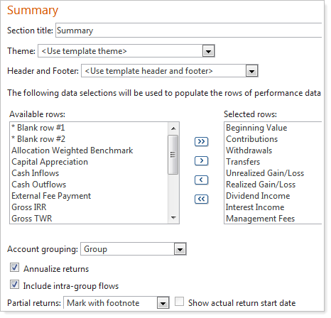 We've added the Capital Flows Dashboard section to the Comprehensive Portfolio Review and Summary templates, and we've added the Account Analytics section to the Performance Review template. The Dashboard section has been added to the Comprehensive Portfolio Review system template only.
