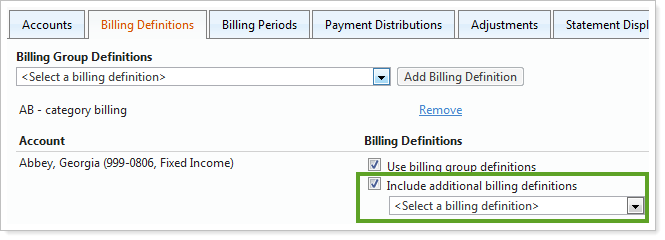 On the Billing Definitions tab, for the account where you want to assign the unique definition, select the Include additional billing definitions check box.