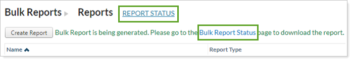 To view the status of your bulk reports, click Bulk Report Status in the Reports menu. In addition, you can find a direct link on the Bulk Reports page.