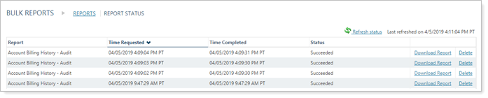 The Bulk Report Status page allows you to view the current status, as well as details about the bulk reports you've run. You can also download your successful bulk reports, as well as delete any reports you don't need.