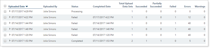 | Completed Date | Identifies the date and time the listed upload was completed. If the upload is still processing, this column will be blank. |
