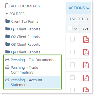 We recommend that you only enable Pershing documents for clients who have Pershing accounts. When you enable the Pershing document vault integration for clients who don't have Pershing accounts, those clients will see empty folders.