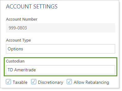 1. Update all of your TD Ameritrade Institutional accounts to use the TD Ameritrade custodian in the Account Configuration settings, if applicable.