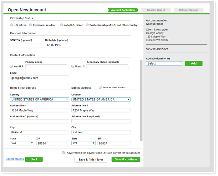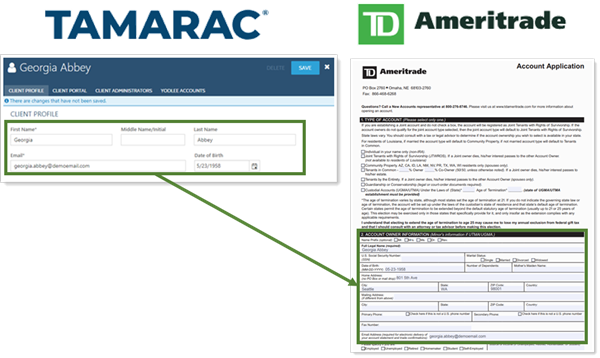 9. In the New Account Opening Wizard, the client's Tamarac data will be automatically filled in. Complete the form through your usual new account process.