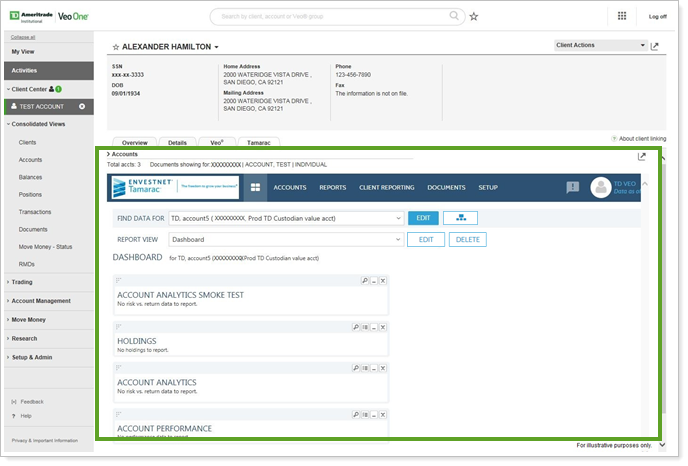 You can make more informed decisions and streamline workflows by accessing data directly from TD Ameritrade Veo® platform from TD Ameritrade Institutional within Tamarac Reporting.