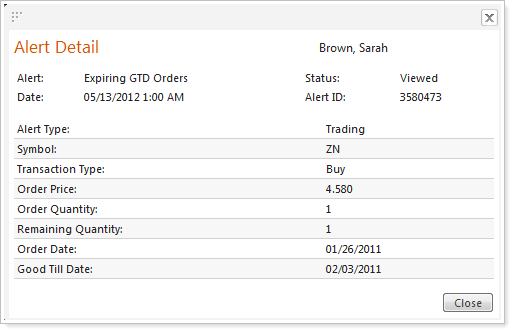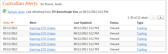 The Alert and Type columns on the report are links that allow you to view the details of the alert. Simply click the link to view the alert details. Reading an alert will not change the “read” status of the alert with the custodian. The status of an alert can only be modified by viewing the alert at TD Ameritrade.