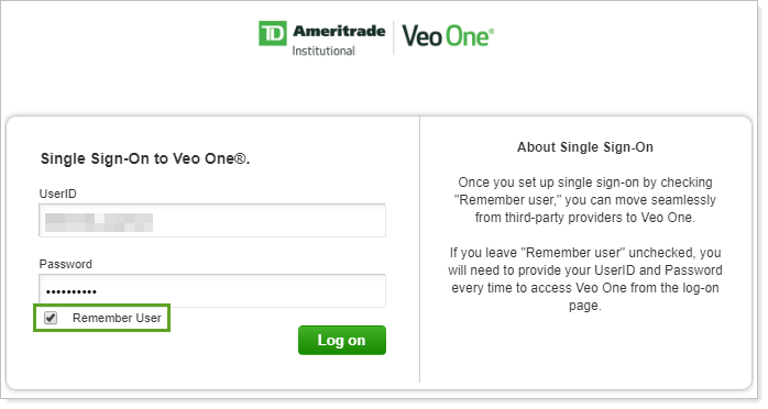 7. The first time you use this process to start new forms, enter your TD Ameritrade Institutional Veo One® credentials and select Remember User. Click Log on. After the first login, Tamarac will automatically log you in so you don't have to enter your credentials.