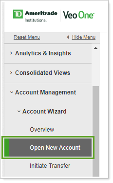 If you forgot to turn your popup blocker off before being directed to TD Ameritrade Veo One, you can access the New Account Opening Wizard from the menu.