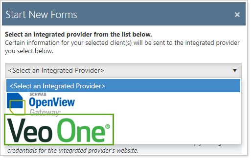 4. In the Start New Forms dialog, select Veo One from the integrated provider list.