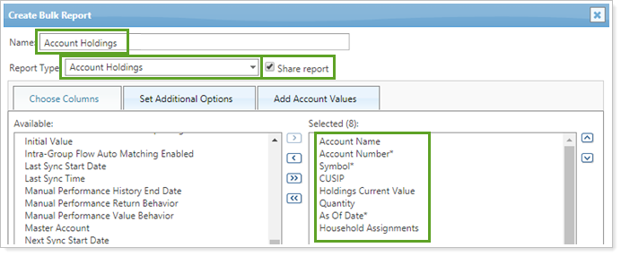 To set up the bulk report for HiddenLevers, in Tamarac, create an Account Holdings bulk report with the following columns in this order. For more information on bulk reports, see Understanding Bulk Data Exports.