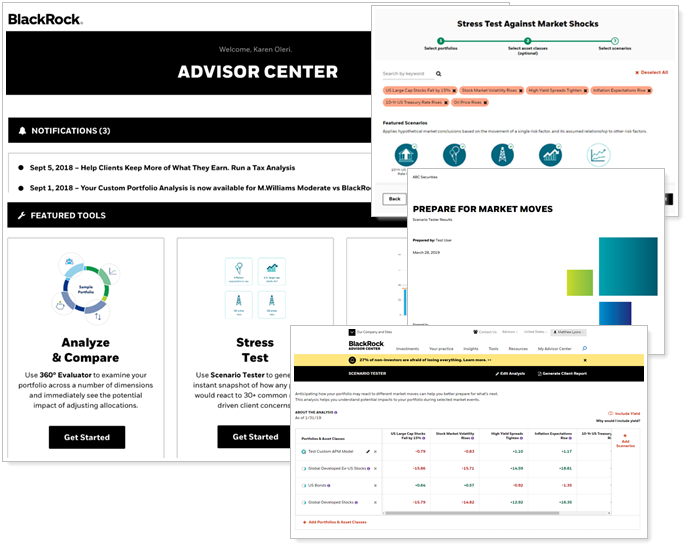 The BlackRock Advisor Center is a free tool that supports your portfolio construction and practice management process by enabling you to: