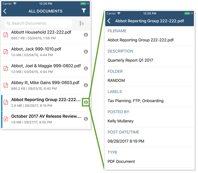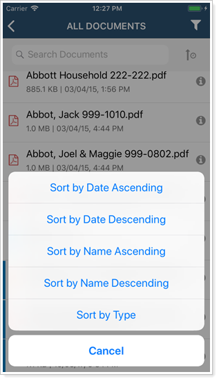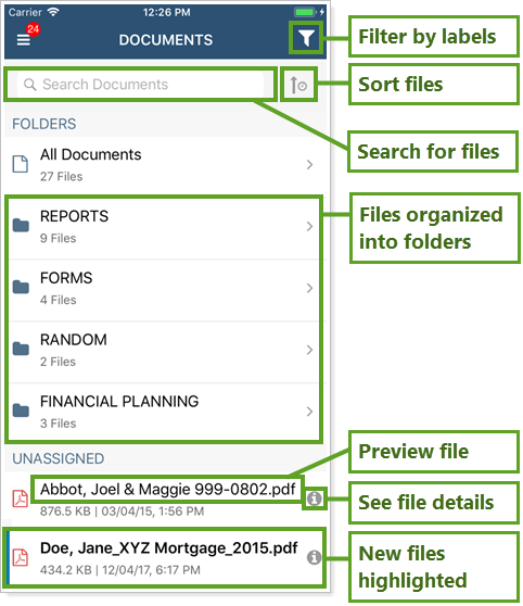 The mobile app offers your clients the same sorting, label, and folder functionality available in desktop client portals. For more information about finding files in the document vault, see Use the Document Vault.