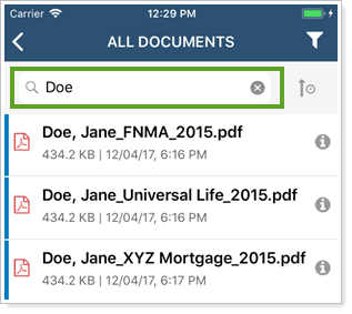 To search for files, tap in the Search Documents bar and type in the search term. Results update as you enter search terms. The Find Documents For list only searches within the current folder. If the file is elsewhere in the document vault, it will not be returned in the results.