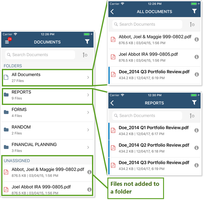 Folders are available in the mobile app document vault to help your clients organize files. In the mobile app, clients cannot add files to folders, whether through drag-and-drop or by direct assignment. To learn more, see Manage Folders. For more information, see Use the Document Vault.