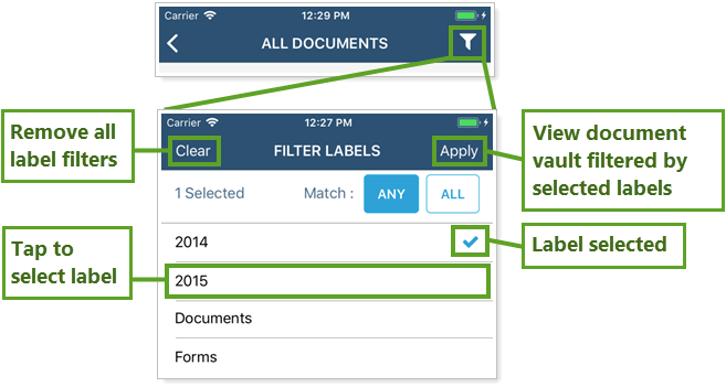 Labels are available in the mobile app document vault to help your clients sort and find specific files. They behave the same in the mobile app as in the desktop client portal. For more information, see Use the Document Vault.