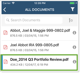 Your clients can use the mobile app to preview files in the document vault without having to first download them. To learn more about previewing files in the document vault, see Use the Document Vault.