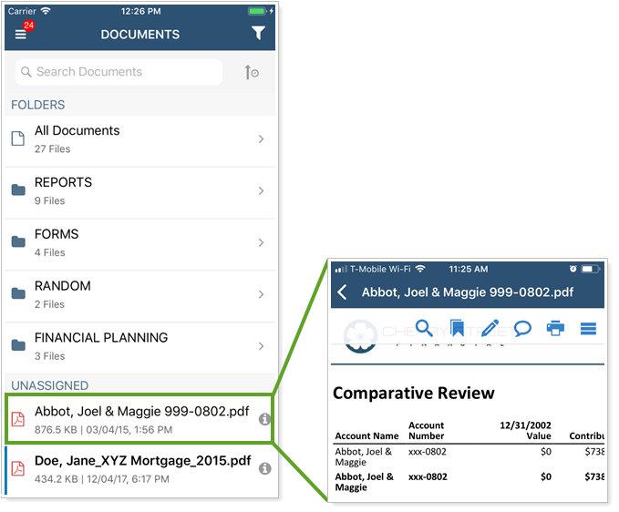 With the mobile app document vault, clients can receive and view documents posted in the document vault. The mobile app provides the many of the document vault features available in desktop client portals, but optimized for mobile viewing and interactions.