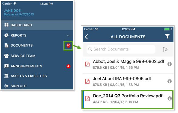 When your firm posts new files to a client's document vault, the mobile app adds a notification on the main menu to alert the client.