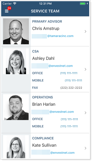 Tap Service Team. All the information provided in Service Teams on the client portal is displayed. A team must be assigned to the client's Household in order for your client to see anything on the Service Team page. For more information, see Service Team.