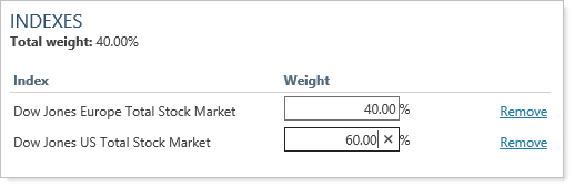 In the Indexes section, specify the weight for each index. The aggregate weight for the indexes must be 100 percent.