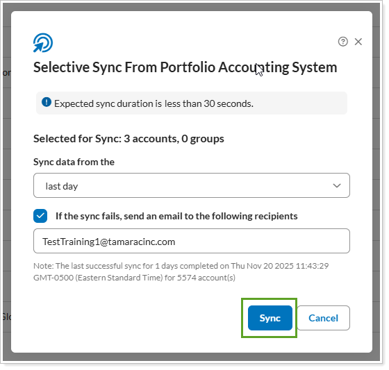 In the Selective Sync From Portfolio Account System panel, confirm the details for your request and select Sync.