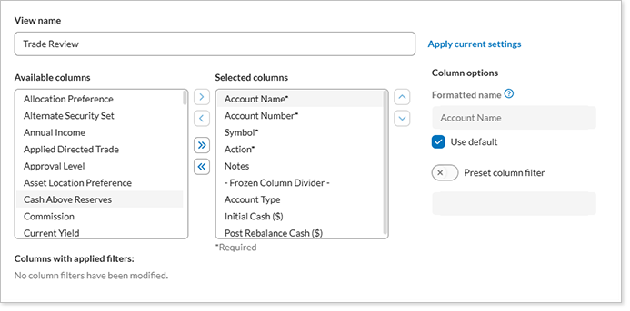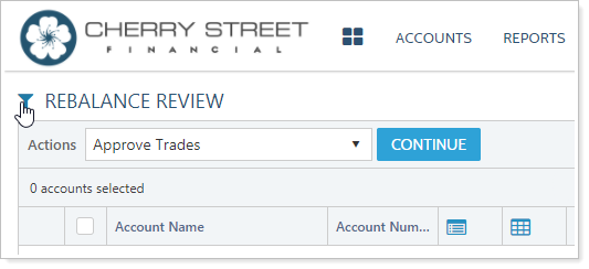 The Rebalance Review page lets you view the results of a rebalance on an account-by-account basis. Each row represents an account, and you can add columns to see rebalance information about that account. You can also take some trading actions, as well as customize your view with additional columns and available filters.