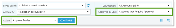 The Approve Trades option in the Actions list allows you to approve any trades within the accounts you've selected. Additional filtering allows you to see which accounts still need trade approval.