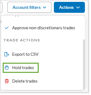 You can select individual accounts and place those trades on hold for future execution. To do this, select the trade and choose Hold Trades in the More Actions list.