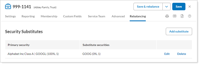 You can apply substitutes at the account level to make sure the substitute is suitable for the specific account. When you need to assign substitute securities for an account, you can use the Security Substitutes panel.