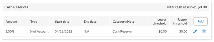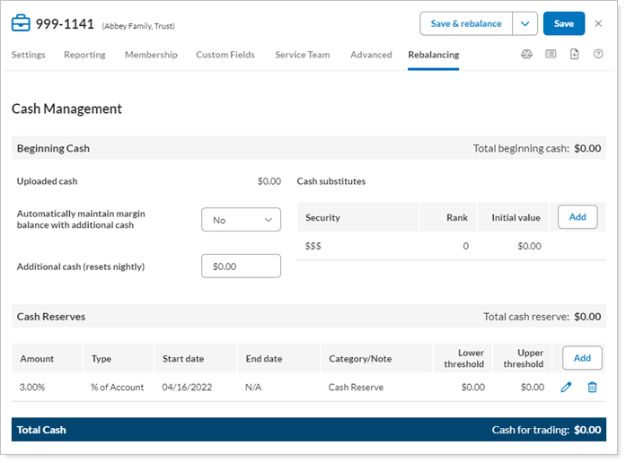 Cash reserves in Tamarac Trading allow you to set aside specific amounts of cash for any cash needs for the client. Cash reserves can be a one-time cash need—like a vacation or cash to purchase a car—or a recurring cash need for management fees, taxes, or Required Minimum Distributions (RMDs).