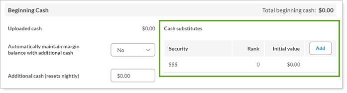 Cash substitutes are securities that you want to treat as cash for monitoring and allocation purposes. However, unlike sweep cash, these securities require that a trade is entered at the custodian. An example of a cash substitute is a client who holds money in a money market fund. You can then add that fund as a cash substitute in the client's account so that the value of that fund is treated like cash.